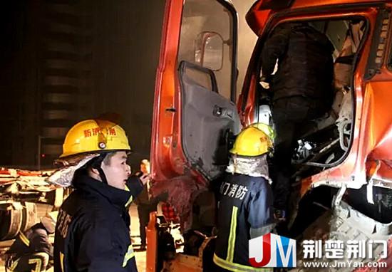 - 2016年1月20日图为:消防官兵救伤者图为:大挂车连环追尾车祸现场图为:消防官兵将伤者救出荆楚荆门网讯(罗蒙胡腾羽)1月18日0时左右,荆门市沙洋县洪岭大道南胜鑫大酒店门口发生一起交通事故,造成3辆大挂车连环追尾,当地公安、消防、医疗等部门迅速赶赴现场。荆门市沙洋县消防中队接到群众报警后,迅速调派2辆消防车和12名消防官兵赶赴现场处置。在事故现场,消防官兵发现,三辆挂车发生连环追尾,后两辆挂车驾驶室严重挤压变形,现...