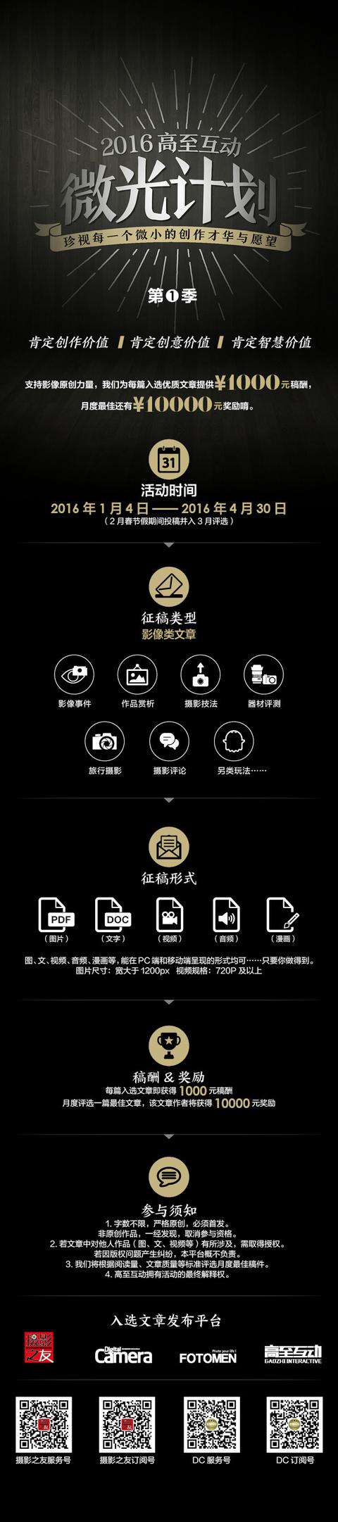 - 2016年1月6日2016高至互动“微光计划”第一季。支持影像原创力量,我们为每篇入选优质文章提供1000元稿酬,月度最佳还有万元奖励。珍视每一个微小的创作才华与愿望。不管是纸媒的黄金年代还是新媒体的风行之时,人们都有阅读优质内容的需求。媒介变了,但我们对好内容的需求从来都没有变。因此,高至互动启动了“微光计划”,以一篇原创稿件千元稿酬的形式,来激发你的创作热情,保护影像圈的原创力量。我们会珍视每一个微小的创作才华...