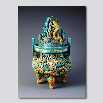 - 2016年1月4日元(1271-1368)通高37厘米、口径22厘米1964年北京西城区德胜门外黄寺出土首都博物馆藏。仿汉代博山炉式样。陶胎。直口、短颈、丰肩、鼓腹,腹下承三兽足。颈部两侧饰对称桥耳,盖与炉用槽口衔接,炉体镂空。炉盖镂雕成层峦叠嶂的山峰,黄色蟠龙蜿蜒穿行于蓝色的山崖间,神态刻画生动。炉身遍体浮雕花枝、云朵。腹部一侧雕昂首展翅的飞凤,一侧雕回首凝视的蟠龙,飞凤和蟠龙相逐游翔于以蓝、绿、白色相间装饰的枝...