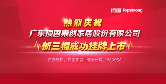 - 2016年1月17日近日,广东顶固集创家居股份有限公司(股票简称:顶固家居,股票代码:833958)在北京全国中小企业股份转让中心举办了新三板上市专场挂牌敲钟仪式。此次挂牌敲钟仪式的成功举办,宣告顶固家居正式迈入资本市场,也标志着顶固家居成为继索菲亚与好莱客成功上市后的第三家定制企业,定制家居行业首家新三板上市公司。顶固家居本次向社会公开转让的总股本为8400.00万股,主办券商为东海证券,交易方式为协议交易。上市发...