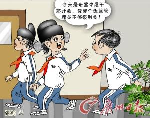 - 2015年10月28日文/记者刘晓星实习生李思颖饭篮管理员、饭盒管理员、电灯开关管理员、午休管理员……这些都是小学里的“官”。如今,在广州的小学里,全班皆是班干部的情况并不少见,还有一些班级让孩子轮流当班干。对于这种做法,老师表示,这是培养孩子的自信心、责任心和荣誉感,体现教育公平。家长对此则有赞有弹。“自从当了午休管理员,我女儿都睡不好觉了,我一度动了向老师请辞的念头。”家长黎女士说。看一看小学班干头衔有哪些饭篮管理...