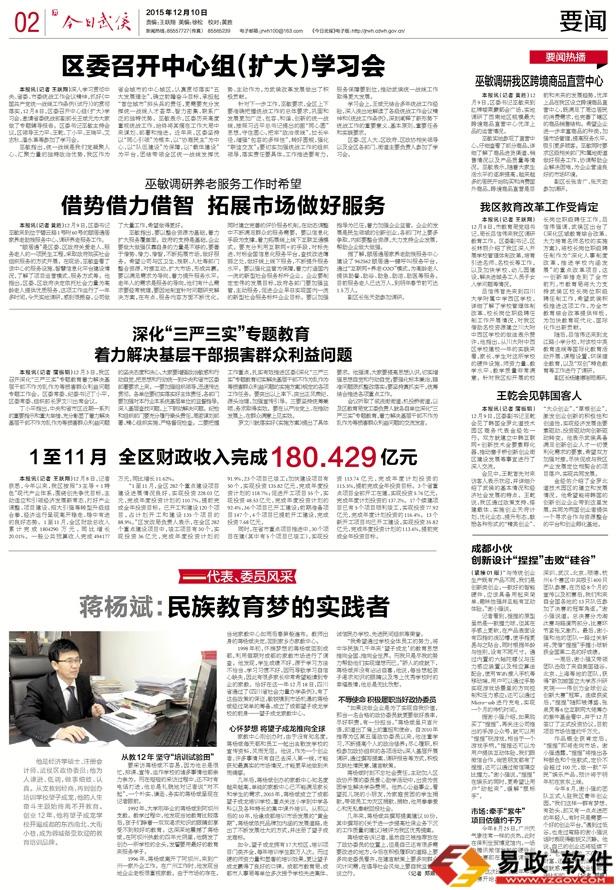 - 2015年12月14日今天是2015年12月16日星期三转到月刊>>蒋杨斌:民族教育梦的实践者代表、委员风采蒋杨斌:民族教育梦的实践者他是经济学硕士、注册会计师、武侯区政协委员;他为人谦逊、低调,做事细致、认真。从支教到经商,再到创办培训学校望子成龙,他的人生奋斗主题始终离不开教育。创业12年,他将望子成龙学校开遍成都的东西南北、大街小巷,成为蓉城备受欢迎的教育培训品牌。从教12年坚守“培训试验田”要采访蒋...