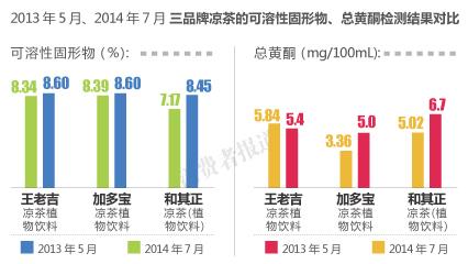 - 2014年8月13日与传统凉茶相比,凉茶饮料因甜而不苦迎合了大众的口味,加上各大凉茶品牌广告大肆宣称凉茶“降火”功效,颇为热销。在王老吉、加多宝、和其正“三国争霸”凉茶市场的大环境下,究竟谁家的凉茶品质更有保证,更符合大众需求?2014年7月,《消费者报道》再次对凉茶饮料进行对比检测,对比此次检测以及2013年5月本刊的送检数据可发现,和其正、加多宝、王老吉等3品牌凉茶的可溶性固形物含量均上升,而总黄酮含量除王老吉略...