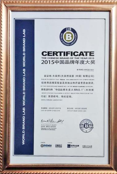 - 2015年12月31日2015年12月28日,2015年第十二届“中国品牌年度大奖NO.1”暨“中国行业十大影响力品牌”评选,在北京举行的“2015总裁世界年会”上隆重揭晓。大自然(大自然家居旗下品牌)和中国国航、北汽集团、华为技术、海尔、苏宁等35个活跃在2015年度中国经济舞台的领军品牌,当选为“中国品牌年度大奖No.1”。“中国品牌年度大奖”,是由全球五大品牌价值评估机构之一的世界品牌实验室,采用品牌影响力评估体...