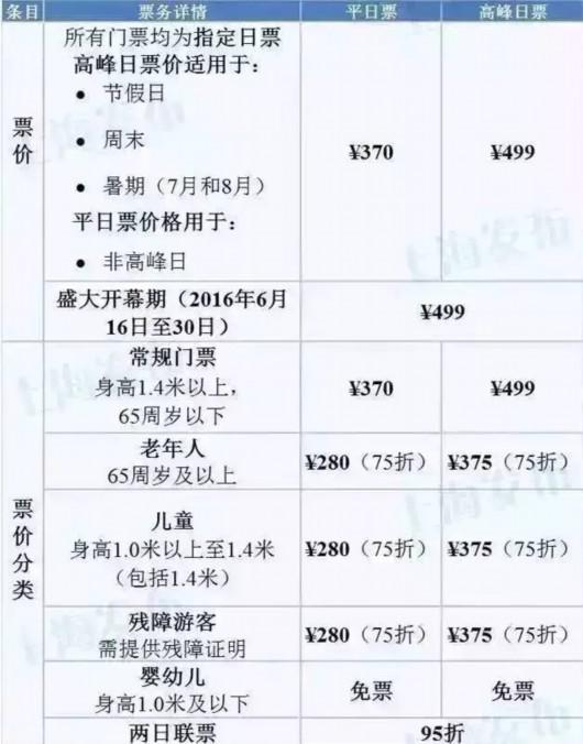 - 2016年2月18日关注吉林在线微信公众平台:OnlineJL,发现更多精彩。吉林在线,咱吉林人自己的门户网站。日前,上海迪士尼乐园公布门票政策和开园时间后,引发了各界关注。根据公告,将于3月28日起售卖门票,6月16日起开业。平日票价格为人民币370元,高峰日票价为人民币499元。据悉,上海迪士尼乐园,斥资55亿美元,主体工程于2011年正式破土动工,是中国第二个、亚洲第三个,世界第六个迪士尼主题公园。与上海相比,...