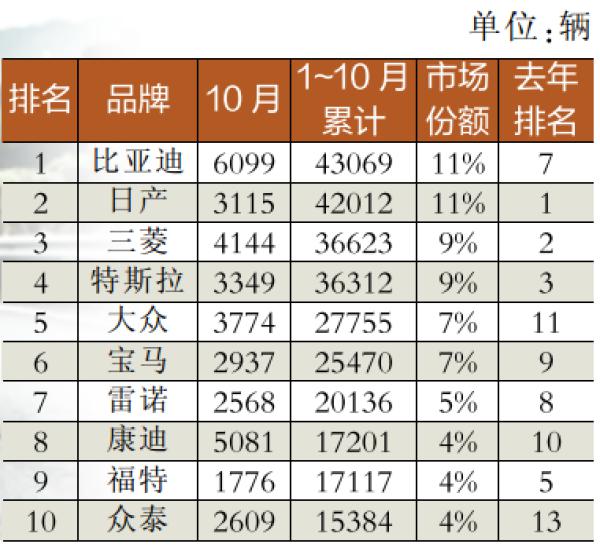 - 2015年12月13日在刚刚出炉的全球新能源汽车销量排行榜上,比亚迪不负众望,再次横扫美、日、德等汽车企业,又一次登上了10月单月销量榜首的位置。至此,在连续6个月销量第一之后,比亚迪1~10月的累计销量也终于拔得头筹。单月、累计销量双双第一,奠定了比亚迪在新能源行业的霸主地位,也标志着比亚迪正式成为全球最大的新能源汽车企业,这也帮助中国汽车企业实现了在新能源领域质的飞跃。国内部分车企新能源汽车1~10月销量排行■先声...