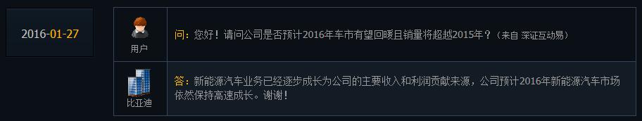 - 2016年1月28日同花顺财经讯1月28日,比亚迪昨日在投资者关系互动平台上表示,新能源汽车业务已经逐步成长为公司的主要收入和利润贡献来源,公司预计2016年新能源汽车市场依然保持高速成长。资料显示:比亚迪主要从事二次充电电池业务、手机部件及组装业务,以及包含传统燃油汽车及新能源汽车在内的汽车业务,同时利用自身的技术优势积极拓展新能源产品领域的相关业务的公司。(同花顺财经原创中心)弱势行情怎么保命关注同花顺财经微信(...