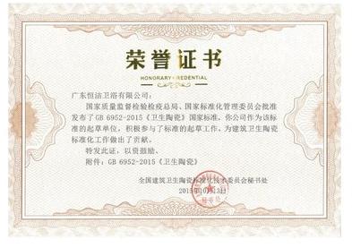 - 2015年11月13日近日,由全国建筑卫生陶瓷标准化技术委员会、国家建筑卫生陶瓷质量监督检验中心牵头,恒洁卫浴等行业龙头企业参与起草的GB6952-2015《卫生陶瓷》国家标准以及GB/T31436-2015《节水型卫生洁具》国家标准,批准发布。广东恒洁卫浴有限公司作为该“新国标”的起草单位,为建筑卫生陶瓷标准化工作做出了突出贡献,因而受到嘉奖表彰。恒洁参与GB6952-2015《卫生陶瓷》国家标准起草荣誉证书恒洁参与...