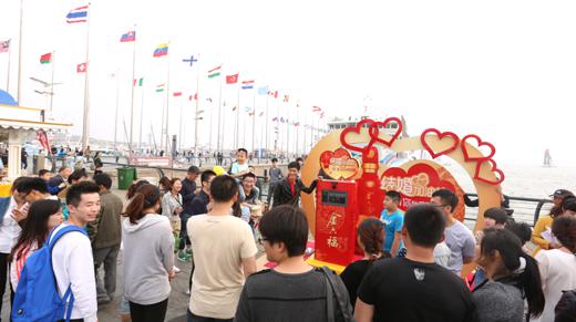 - 2015年5月11日随着白酒市场竞争的白热化,婚庆用酒作为一个用量大、口碑传播较为广泛,互动影响较强的一块大蛋糕,越来越被众多的白酒企业所看重。五一之后即将迎来的婚庆旺季,让不少品牌酒企摩拳擦掌,瞄准市场这一难得商机。五一小长假期间,一款号称“表白神器”的神奇装置,吸引众多青年驻足围观并参与互动,大胆为爱呐喊。据了解,这个“表白神器”名叫“结婚加油站”,高3米,宽5米,玩法创意、设计喜庆,由一台分贝互动装置与“金六福...