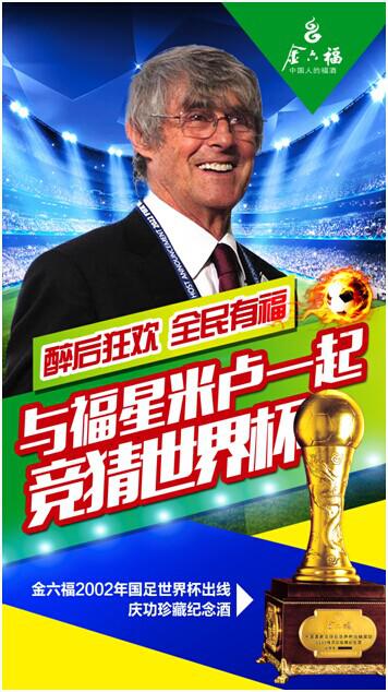 - 2014年7月8日7月8日,万人瞩目的四强赛大战在即,本届世界杯已进入最后的狂欢。值此关键时刻,福星怎能缺席?米卢携手金六福,与全民一起竞猜“醉后”世界杯。这是继2002年共同见证国足出线后,米卢与金六福再次携手与中国球迷结缘世界杯,旨在“拯救”本届世界杯赛场外损失惨重的中国球(cǎi)迷(mín);在给他们带来福气的同时,也拿出了十二年前的国足出线见证者——2002年金六福国足出线庆功珍藏纪念酒,来犒赏中国球迷,...