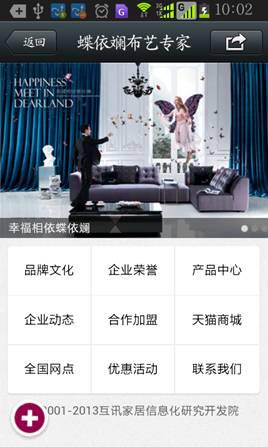 - 2014年5月5日字号:微信作为时下最热门的社交、信息交流新媒体,正在演变成为一大商业交易平台,影响着全国乃至全球5亿多网民,引领“微时代”的繁荣与快速发展。蝶依斓布艺专家走在行业创新前沿,在2014版官方网站更新升级的同时聘请专业的微网站策划团队,开发时下最流行微网站并于近日已正式上线。服务号微网站设置包括企业动态、合作加盟、产品中心、品牌文化、全国网点、企业荣誉、联系我们等栏目,力求为有需求的客户提供一个更好的...