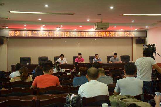 - 资讯7月26日,深圳市雅兰家纺科技有限公司和新浪湖南一起向桃江县捐赠价值百万元的赈灾物资。仪式结束后,桃江县15个乡镇民政所负责人将物资运回了乡镇。新浪湖南讯“请你们放心,我们一定将所有夏被送到受灾群众手中,让你们的爱心在桃江传递。”7月26日,深圳市雅兰家纺科技有限公司向益阳市桃江县民政局捐赠价值百万元的赈灾物资——1488床夏被。捐赠仪式结束后,桃江县15个...